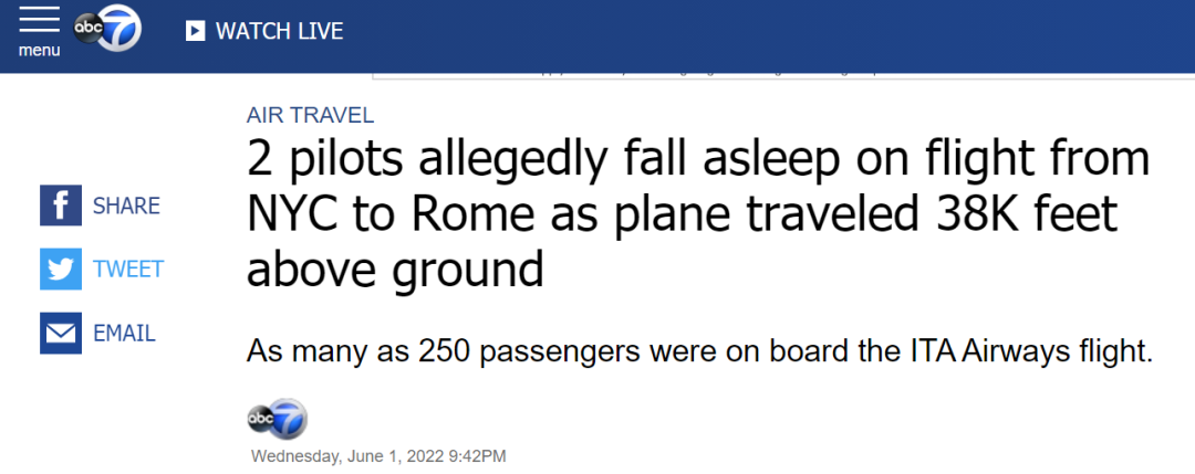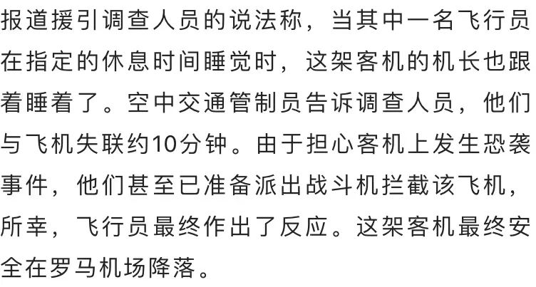 一架载有250名乘客、从美国纽约飞往意大利罗马的客机,一度在法国上空失联10分钟,引发恐袭担忧,差点惊动法方准备派战斗机拦截。之后,竟发现原来是机上包括机长在内两名飞行员都睡着了,未回应控制塔台呼叫,只是“虚惊一场”。