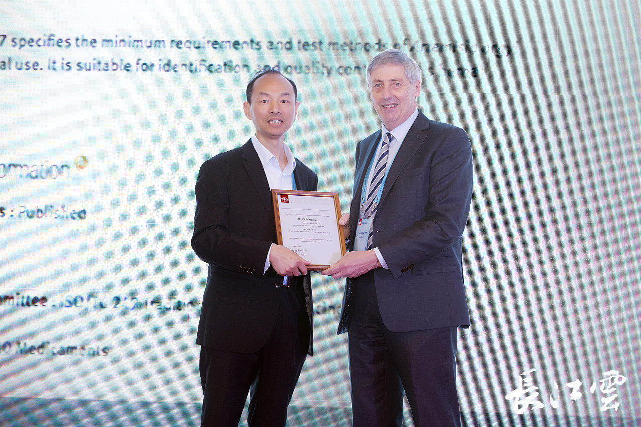 2018年6月4日,国际标准化组织中医药技术委员会(ISO|TC249)时任主席为万定荣授予国际标准制定奖牌