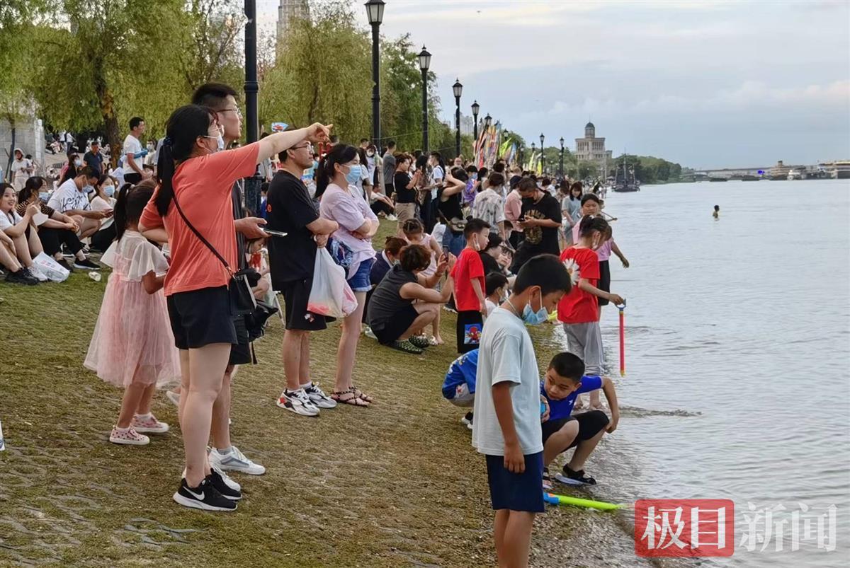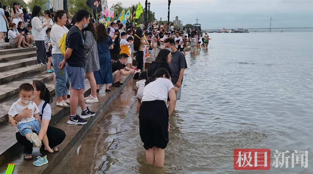 不少人正在江边踏浪亲水,享受清凉。现场有工作人员来回巡逻,提醒市民和游客注意安全。在部分区域,工作人员拉起了警戒线。