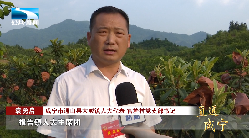 咸宁市通山县大畈镇人大代表、官塘村党支部书记 袁勇启:“报告镇人大主席团,再通过我们村委会准备把这个山协调一起承包过来,资金短缺问题,一是通过贴息贷款,通过一些部门进行对接,对袁修港种植户进行帮扶,作为人大代表要跟踪这个事。”