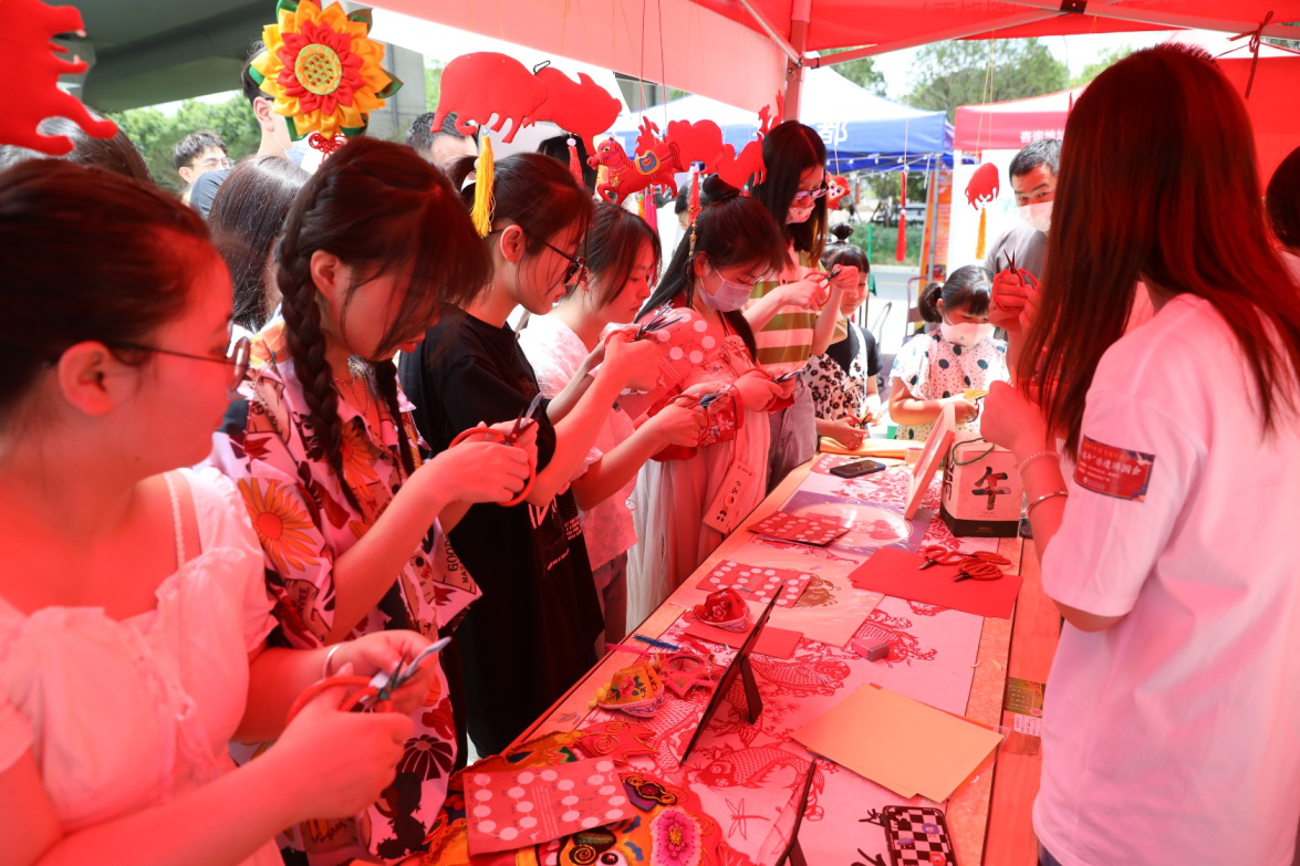 剪纸、香囊展台前,特邀嘉宾、剪纸非遗传承人金俊安正在教授香囊制法。只见剪刀、针线巧妙配合,一个个精美绝伦的香囊罗列桌上,引得周围同学跃跃欲试。“先对角折,缝合,然后留反口……”汉语言2004班的施静宜第一次制作香囊,在一番认真摸索后,一个精致的端午香囊在她手中缝制完成。学习剪纸的同学也个个心灵手巧,不一会儿功夫,喜庆的窗花、娇俏的花朵、逼真的小动物……一幅幅精美的剪纸作品引来师生连声赞叹。