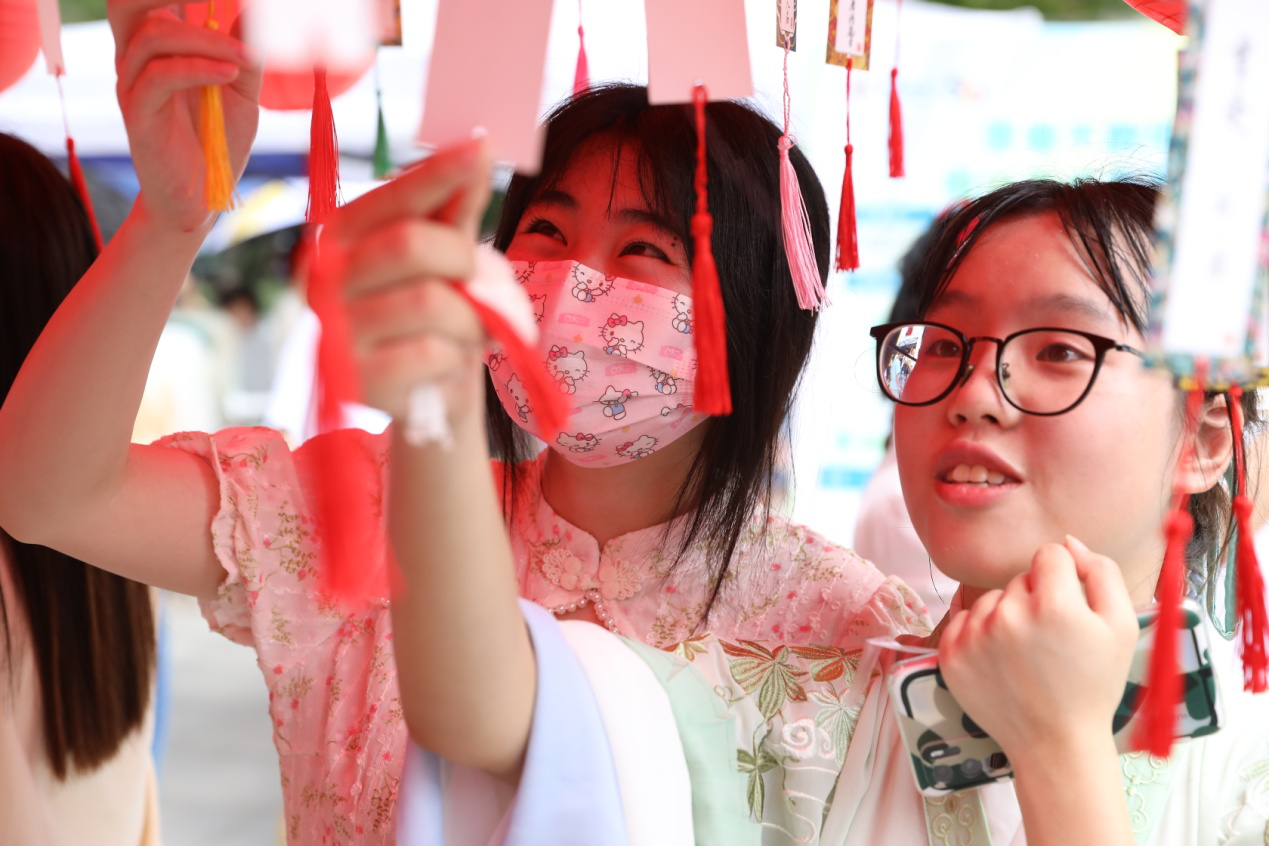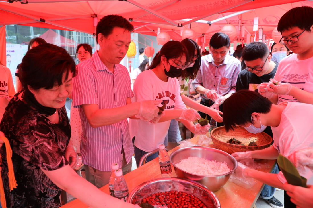 “祝同学们端午安康!”游园会上,校党委副书记邹星庐、校长助理王洪波、图书馆长詹萌与同学们一起包起了粽子。折叠粽叶、放入糯米、加一颗红枣、缠绕棉线……亲手体验中,师生们有说有笑,其乐融融。