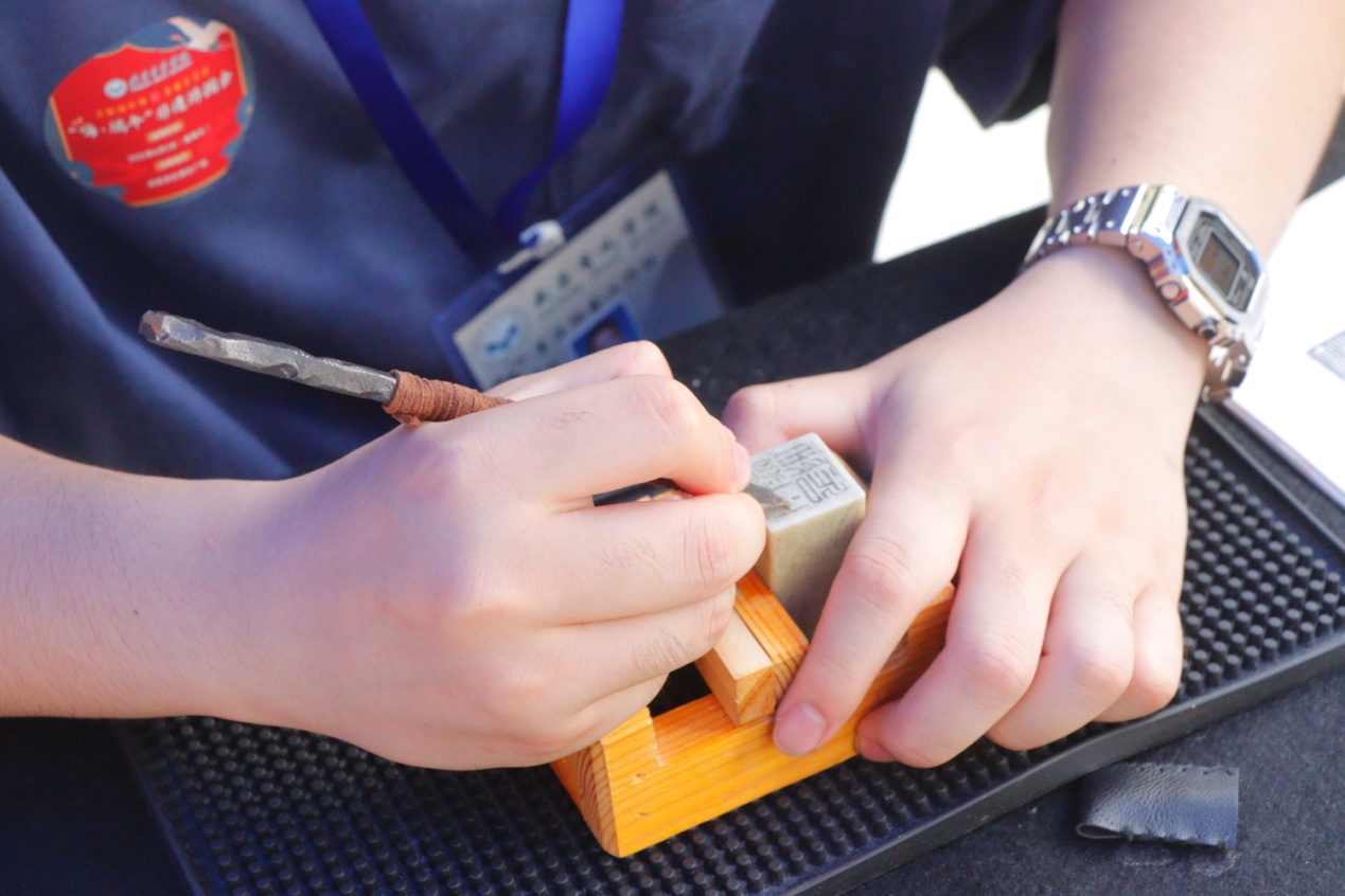“大家可以自由选择喜欢的字进行组合拓印,还可以将成品带走哦!”汉语言2004班的商雅婷正在介绍活字印刷的操作方法。整齐排列的活字印刷工具中,不乏DIY手工社的同学亲手雕刻的二十四节气、汉字等橡皮章印。机器人工程2003班的李艺爽手指摩挲着一颗颗小小字章,“这些橡皮章都是一刀一划刻出来的,能看出来制作过程非常复杂。”颗颗反字的流线触感,与其在纸上拓印出的工整字体形成强烈对比,让人不禁感叹古人的无限智慧。