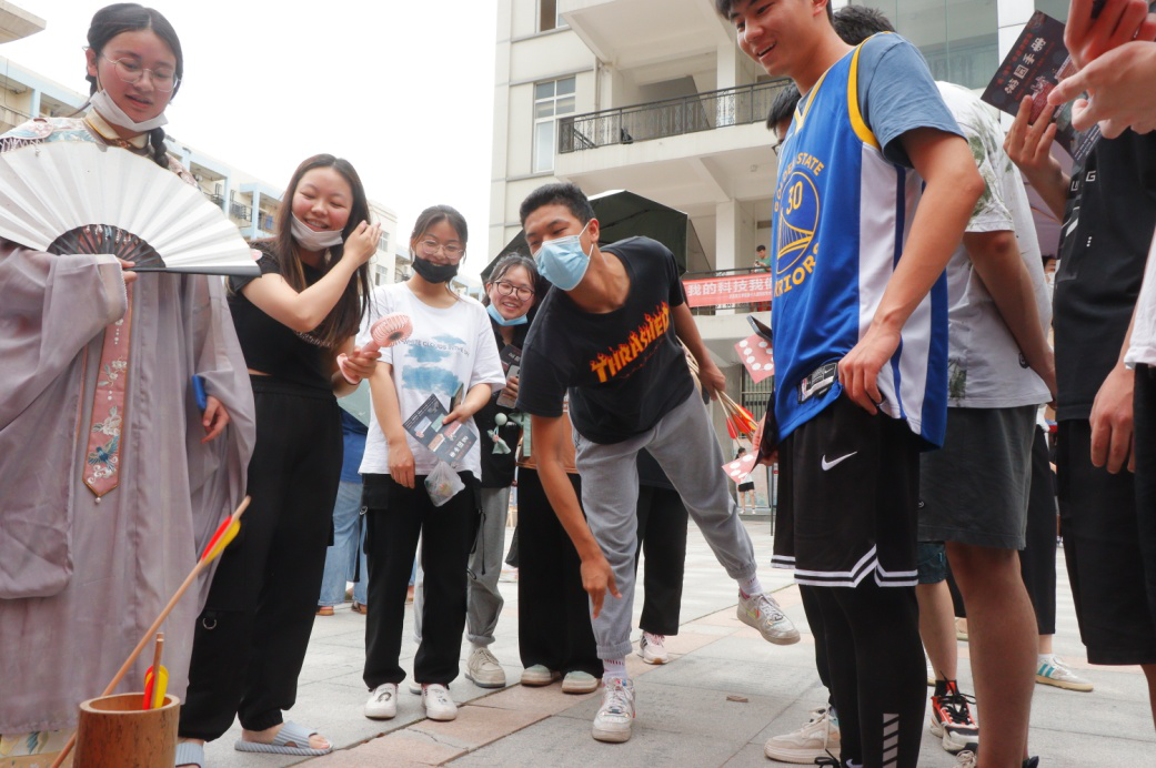 “投中了!投中了!”“哎呀!就差一点!”叮当脆响伴着阵阵呼声从簇拥的人群中传出,只见一位身着汉服的“忆回汉服社”成员神态优雅,手拿一支箭正瞄准壶口,周围人屏住呼吸,紧张热烈的氛围逐渐在现场蔓延开来。随后不断有同学上前尝试,与对方一较高下。“本以为投壶只要瞄准投中就行,但真正上手了才知道有多难。”新闻2001班的肖玉容笑着说,这次游园会中她体验了许多传统非遗项目,尽兴享受的同时更深刻地感受到了中华传统文化的底蕴风流,让人不自觉就喜爱上了。