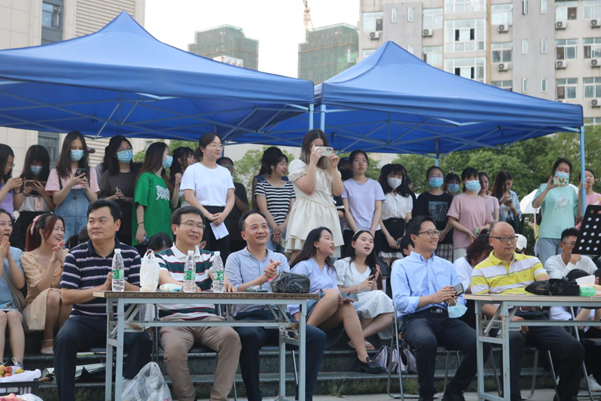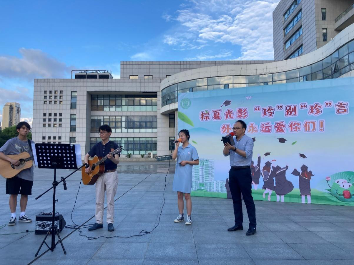 当天下午5点半,武汉轻工大学外国语学院党委书记何敏、院长习强毅,院党委副书记潘春波,副院长陈国良、李鹏等领导班子成员,学院党委原副书记田禾彦,辅导员赵玲、庞珍,来到青春广场为同学们一一发放粽子、桃李等礼物,向大家问好并致以节日祝福。陈国良、田禾彦还与同学们一同弹唱《祝你一路顺风》,引起大家的强烈共鸣,把现场气氛推向高潮;潘春波也与2位同学合唱了一首老歌《心愿》,祝福2022届毕业生都能跨越星辰大海,实现自己的心愿。师生们用双手打着节拍一起合唱,青春广场一时间成了欢乐海洋。