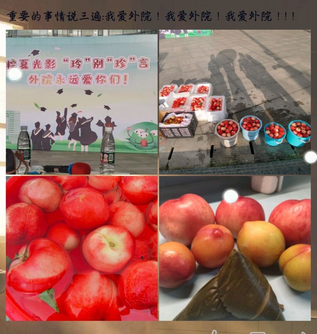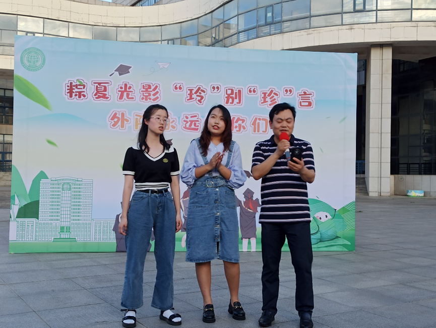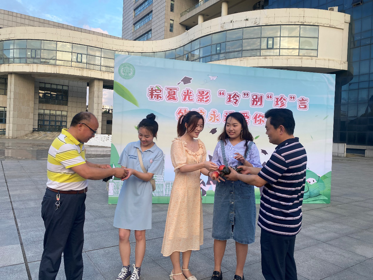 毕业逢端午,桃李沁芬芳。6月3日下午,武汉轻工大学外国语学院于金银湖校区青春广场为2022届毕业生们准备了一场惊喜“盛宴”:精心筹划的欢送会,异彩纷呈的歌舞表演,爱心香粽和新鲜桃李……特别是以赵玲、庞珍二位辅导员名字命名的“谐音欢送会”,伴着丝丝缕缕的粽香、香甜可口的桃李、领导老师们的殷殷嘱托,让同学们感受到了浓浓的关爱和传统佳节氛围。