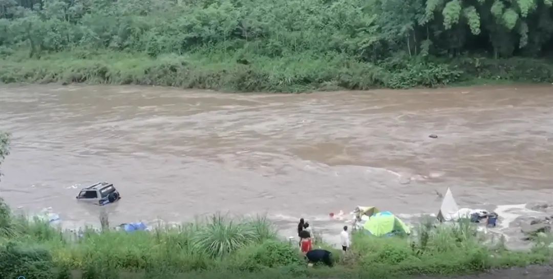 网传视频显示,一辆灰色的越野车浸泡在河水中,车身随着湍急的水流打转,车尾灯一闪一闪的,正缓慢地向下游漂去。岸边站着两男两女,身边还有帐篷被泡在河水中。