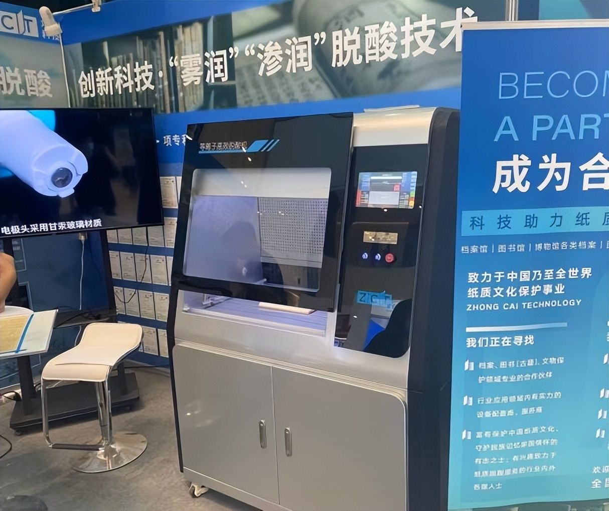 展会上,杭州众材科技有限公司将他们的设备搬到了现场,既有单页纸张的润雾脱酸技术,也有整册书渗润脱酸技术,可应用于图书、古籍、字画、经卷、票证等等。董事长徐春辉表示,随着明清古籍、近代文献等纸质文物酸化损毁窗口期的到来,未来30年是酸化纸质文档保护的黄金期。“纸张内生性酸化机制导致纤维断裂、脆化糟朽,普通纸质文档安全保存周期使50年到100年。经过我们的脱酸技术处理,可以使档案本体延长寿命3到5倍。”