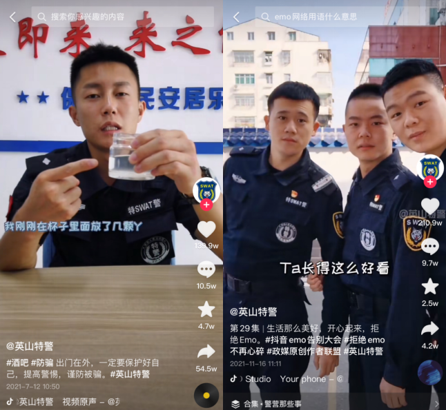 作为政务信息,自带严肃“体质”,在吸引网民关注上面临更大挑战。数据分析发现,公检法部门在探索法治宣传的创新表达上下足了功夫。房县公安局官方抖音号“平安房县”发布视频《正午阳光灿烂,一起来运动吧》,阳光下身着制服的交警小哥在工作休息间歇跳了一段“兔子舞”被旁观者拍下,获得网民点赞25万次,跟评纷纷表示“好可爱的警察蜀黍”“调皮的警察也有可爱的一面”。英山县公安局巡特警大队官方抖音号拍摄趣味短剧《出门在外,一定要保护好自己,提高警惕,谨防被骗》,警官出镜自编自演酒吧最新诈骗套路,以最接地气的演绎轻松科普,点赞量近140万。