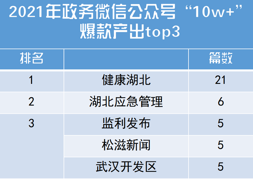 以省直部门为例,湖北省卫生健康委员会官方微信号“健康湖北”有21篇文章浏览量达“10w+”,位列第一。湖北省应急管理厅官方微信号“湖北应急管理”今年仍以稳定的表现位列微信平台“10w+”前列。