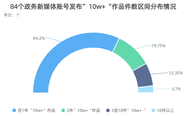 数据显示,微信公众号、抖音视频号浏览量、点赞量“10w+”的作品共计201篇,来源于84个政务新媒体帐号。这些账号中,不乏去年就榜上有名的旧面孔,也涌现出一些今年突出重围的新秀。