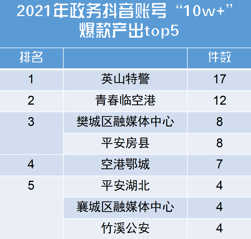 县(市、区)方面,英山县公安局巡特警大队官方抖音号“英山特警”以17条“10w+”点赞作品位列榜首,其中2条作品点赞破百万次。数据显示,2021年11月中旬“英山特警”粉丝量突破100万大关,成为当前黄冈市粉丝量最大的政务官方抖音号。共青团东西湖区委员会官方抖音“青春临空港”表现抢眼,凭借《团团很努力》特辑中的12条“10w+”点赞作品位列第二。
