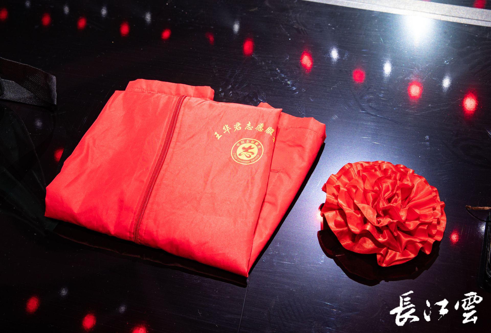 尹文杰献出的是一朵大红花(图右)。这是尹文杰在部队当兵获得表彰时佩戴在胸前的。这朵红花象征着军人的荣誉与责任。今天,它又代表着铁军之魂,盛放在我们的现场!