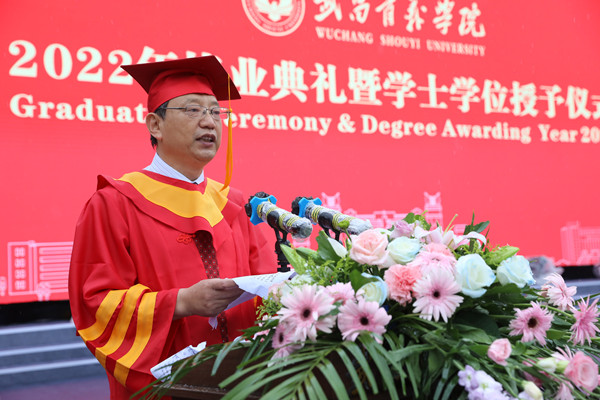 武昌首义学院校长李崇光向2022届毕业生顺利完成学业踏上人生新征途致以最美好的祝福,并深情寄语同学们:坚守梦想,志存高远,在步入社会之时,树立远大目标,为实现自己未来美好生活而奋斗;承担责任,勇于担当,在未来的人生中,修身齐家治国平天下,做一位对家庭、社会、国家有责任担当的人;爱岗敬业,脚踏实地,在新的工作岗位努力工作,做一个组织放心、同事尊重、朋友喜爱的社会有用之才。