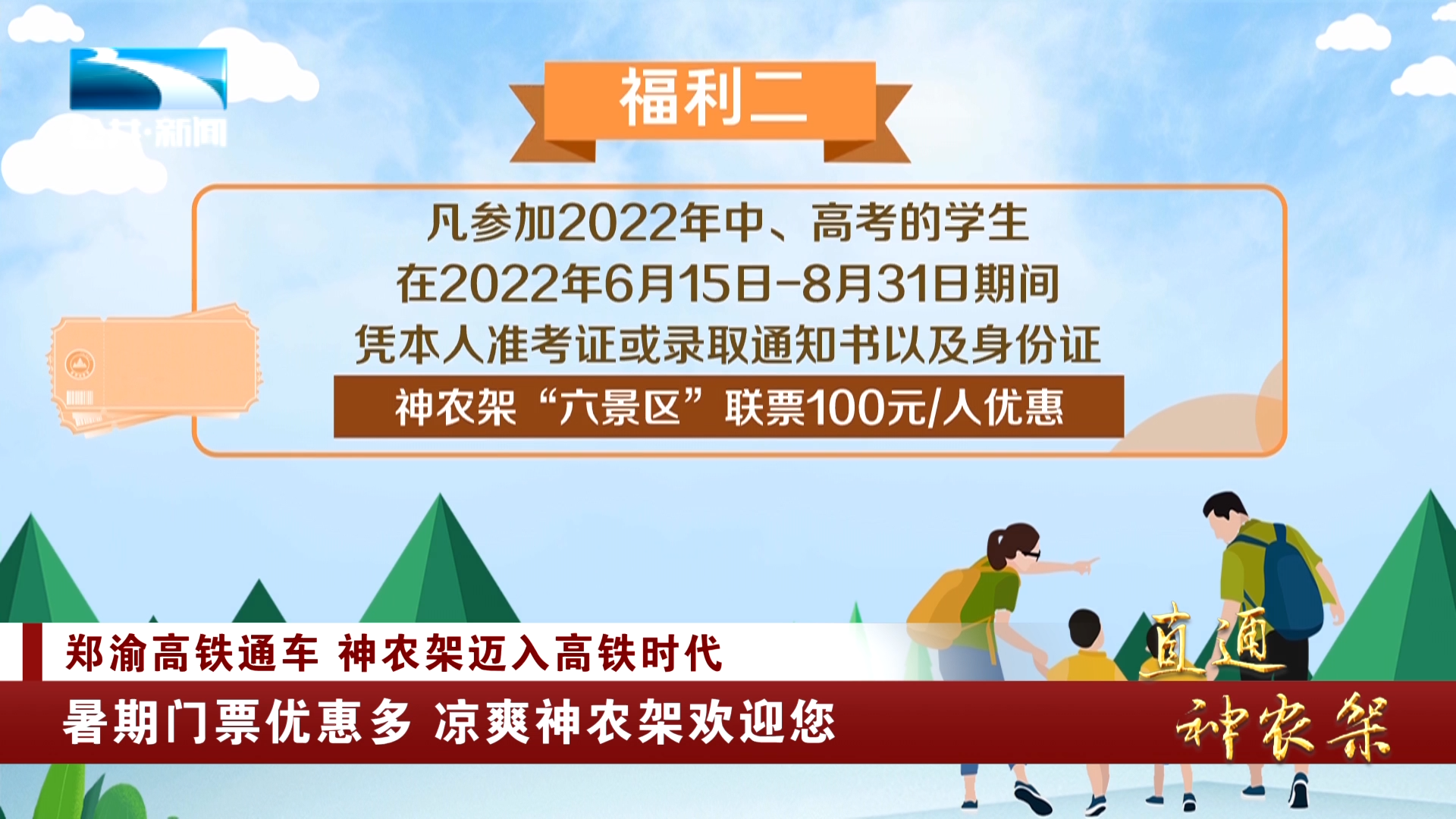 福利二:凡参加2022年中、高考的学生,在2022年6月15日--8月31日期间,凭本人准考证或录取通知书以及身份证,可以享受神农架“六景区”联票100元/人的优惠;