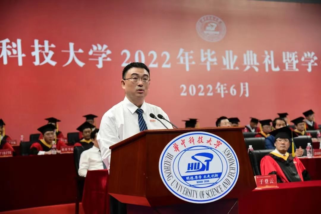 “在世界局势风云变换的时代,面对充满无限机遇和挑战的未来,希望同学们拥抱大时代,胸怀大格局,展现大作为,彰显大情怀,在迈向第二个百年奋斗目标的新征程中谱写青春华章。”校长尤政以《拥抱大时代 一起向未来》为题,发表毕业致辞。回顾华中大70年校史,尤校长深情讲述到“华中大70年来坚持‘顶天立地,追求卓越’。‘顶天’就是心中有理想,‘立地’就是脚下有方向,而‘追求卓越’则是一种精神上的跃迁,不断超越自我,精益求精,从优秀走向卓越”,鼓励同学们应该坚持华中大的优良传统,顶天立地,追求卓越,勇当服务国家振兴伟业的栋梁之才,争做堪当民族复兴重任的时代新人。