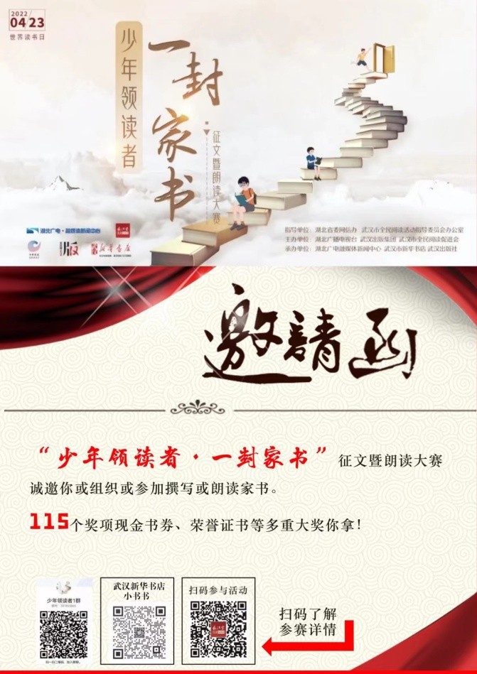 据武汉市新华书店负责人介绍, 少年领读者•一封家书”征文暨朗读大赛是“2022武汉童书展”期间的重要活动之一,欢迎更多学生积极投稿参与。暑假期间,还将举行多场“主题书展+阅读分享”等线上线下活动。