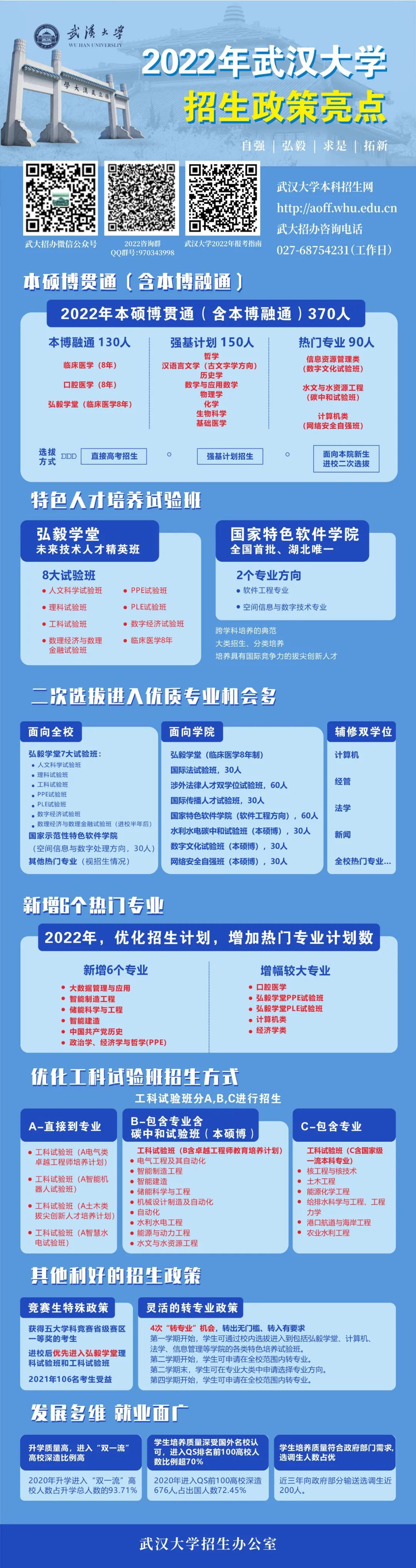 一是弘毅学堂作为武汉大学跨学科培养的典范,通过大类招生、分类培养的方式培养具有国际竞争力的拔尖创新人才,基于武汉大学学科交叉融合的优势,在新兴交叉发展领域开设各类跨学科专业。积极和华为合作,利用优质实践教学平台,瞄准国家重大战略需求,聚焦前沿开设未来技术人才精英班。近年来弘毅学堂毕业生超过80%去到世界名校、国内名校深造。弘毅学堂包含8大试验班——人文科学试验班、理科试验班、工科试验班、数理经济与数理金融试验班、PPE试验班、PLE试验班、数字经济试验班、临床医学8年。进入弘毅学堂试验班有两种方式,第一可以直接通过高考招生,今年招生计划310人;第二可以进校后通过二次选拔进入。
