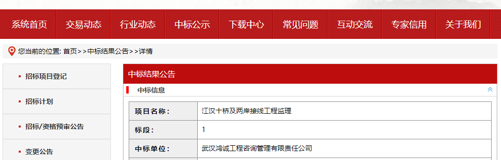 6月29日,武汉市公共资源交易中心官网发布《江汉十桥及两岸接线工程监理》中标结果公告。