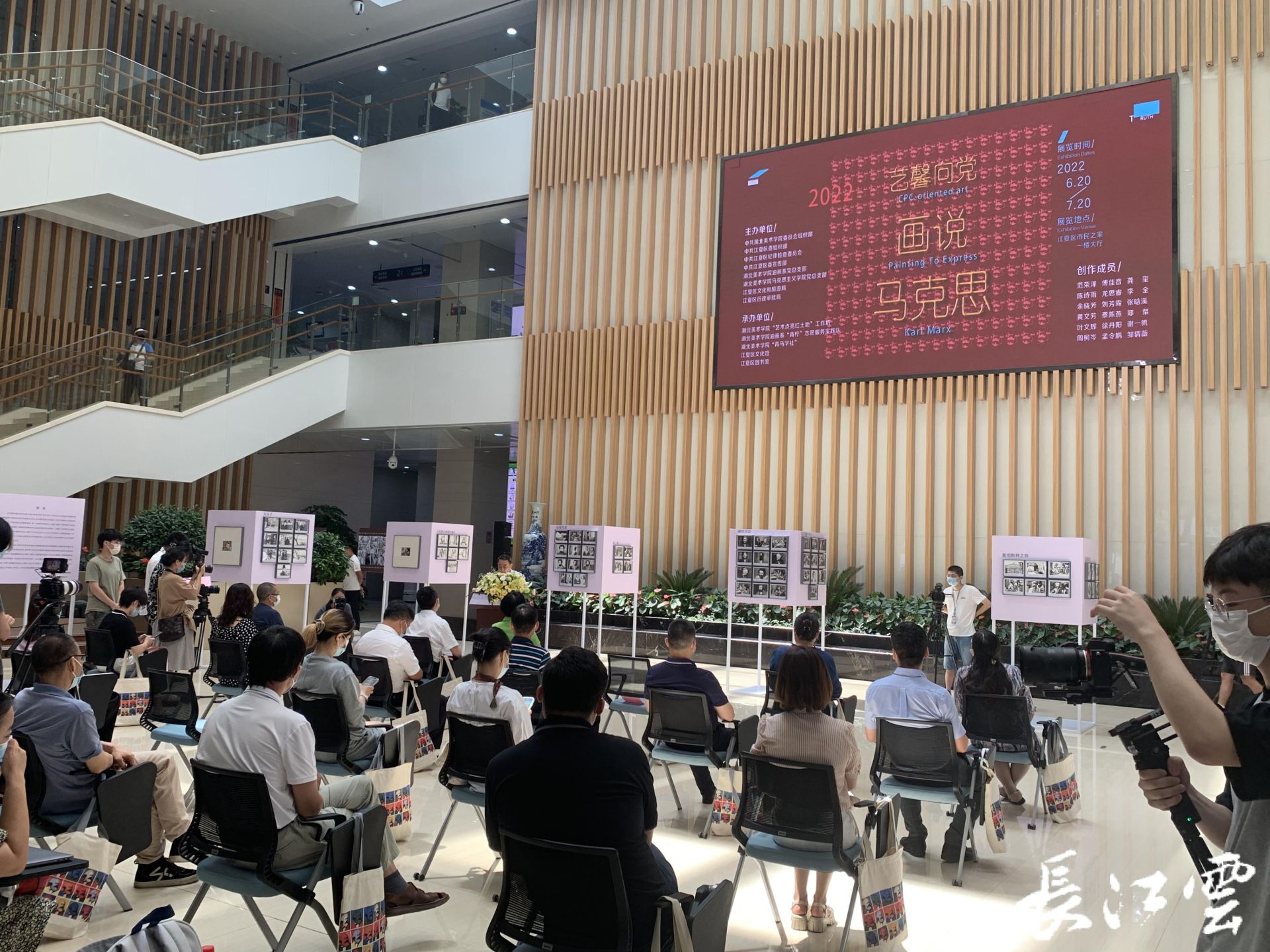 为迎接党的二十大胜利召开,由中共湖北美术学院委员会组织部、中共江夏区委组织部、中共江夏区纪律检查委员会、中共江夏区委宣传部、湖北美术学院油画系党总支部、湖北美术学院马克思主义学院党总支部、江夏区文化和旅游局、江夏区行政审批局联合主办的“艺馨向党• 画说马克思”展览,7月1日在江夏市民之家一楼大厅展出。