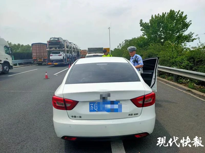 接到警情后,三中队中队长戴中锋带领辅警王琦、汪洋立即上路寻找涉事的车辆。恰巧前方因事故堵车,更方便寻找目标车辆,10多分钟后,民警便在车流中发现了目标车辆。戴中锋立即将该车引导到应急车道并拦停。
