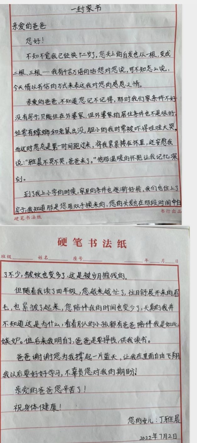 今天,“少年领读者·一封家书”编辑组收到了来自武汉市东西湖区金银潭小学的丁雅同学写给爸爸的一封信,表达了爸爸的感激之情。