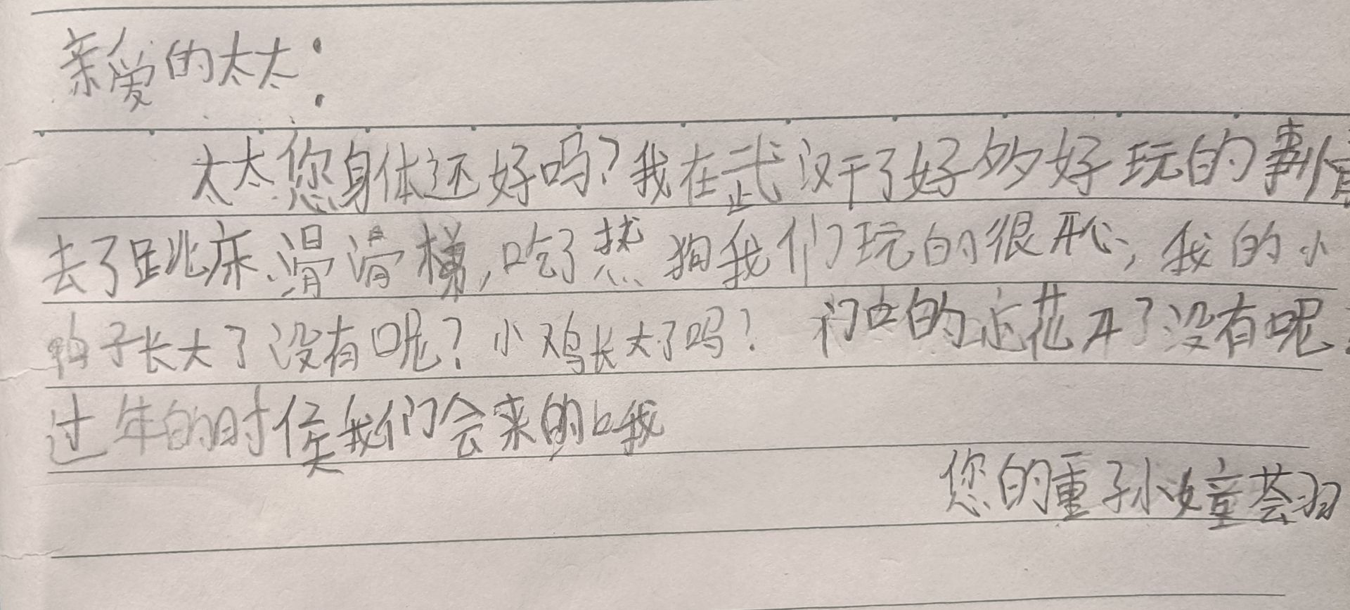 今天,“少年领读者·一封家书”编辑组收到了来自武汉市东西湖区金银潭小学的童荟羽同学写给太奶奶的一封信,表达了她对太奶奶的思念之情。