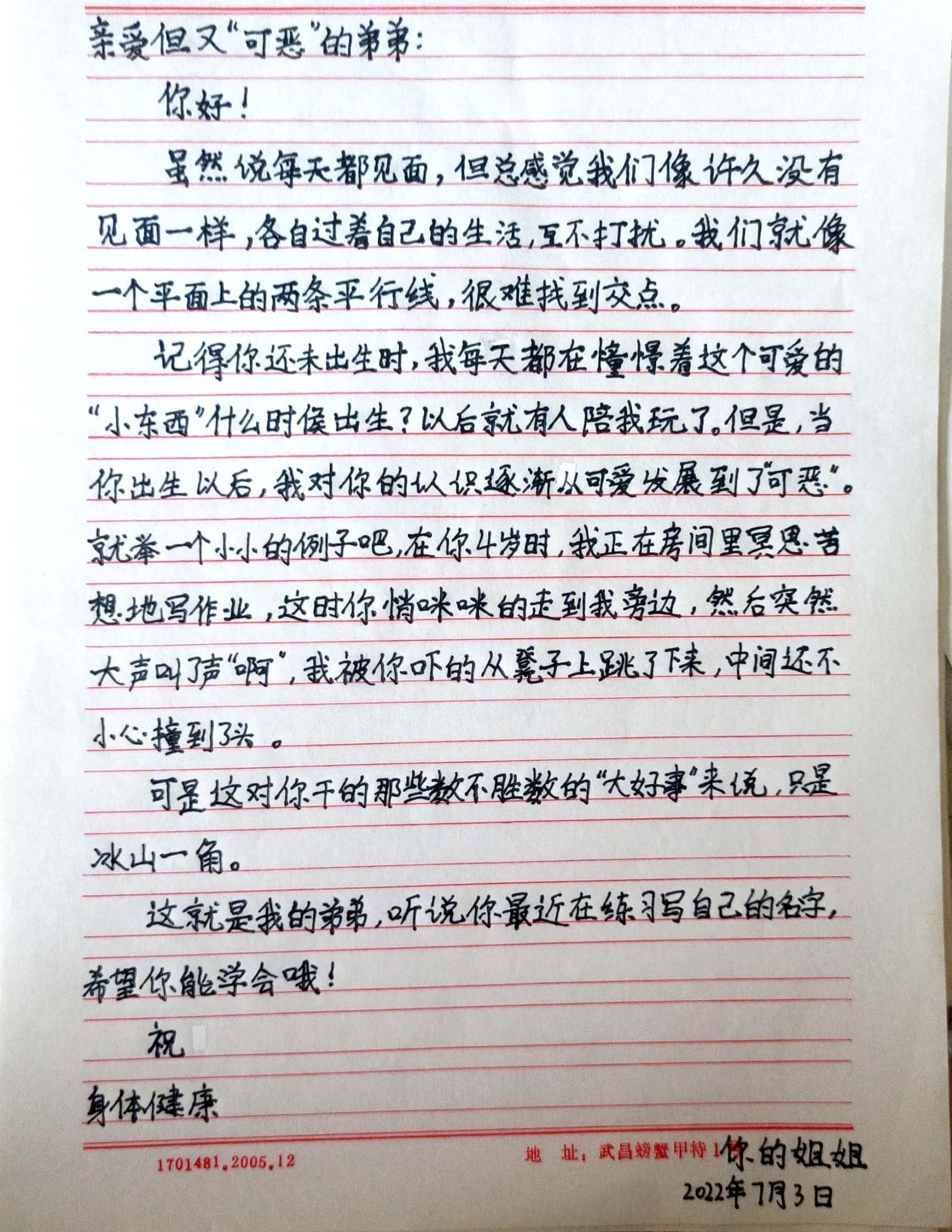 今天,“少年领读者·一封家书”编辑组收到了来自武汉市东西湖区金银潭小学的陈卓菡同学写给弟弟的一封信。