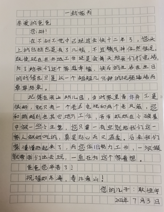 今天,“少年领读者·一封家书”编辑组收到了来自武汉市东西湖区金银潭小学的耿恒宇同学写给爸爸的一封信。