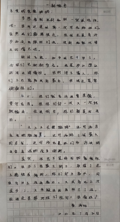 今天,“少年领读者·一封家书”编辑组收到了来自武汉市东西湖区金银潭小学的黄诗怡同学写给爸爸妈妈的一封信。