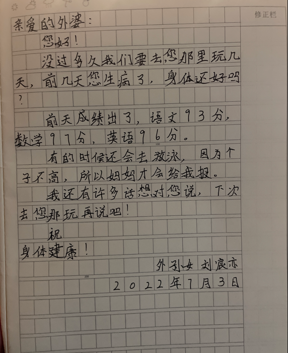 今天,“少年领读者·一封家书”编辑组收到了来自武汉市东西湖区金银潭小学的刘宸亦同学写的一封信。