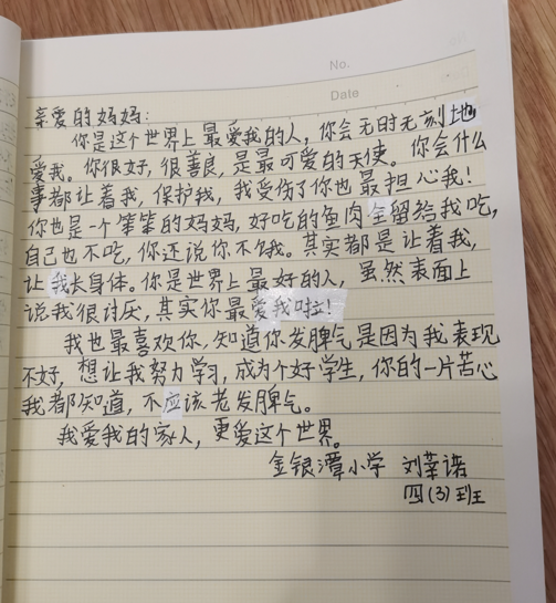 今天,“少年领读者·一封家书”编辑组收到了来自武汉市东西湖区金银潭小学的刘莘诺同学写的一封信。