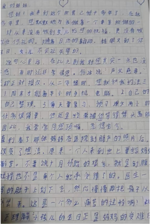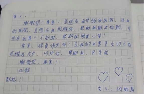 今天,“少年领读者·一封家书”编辑组收到了来自武汉市东西湖区金银潭小学的杨妙菡同学写的一封信。