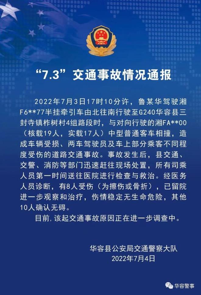 据湖南华容县公安局交通警察大队7月4日通报,2022年7月3日17时10分许,鲁某华驾驶湘F6**77半挂牵引车由北往南行驶至G240华容县三封寺镇柞树村4组路段时,与对向行驶的湘FA**00(核载19人, 实载17人)中型普通客车相撞,造成车辆受损、两车驾驶员及车上部分乘客不同程度受伤的道路交通事故。