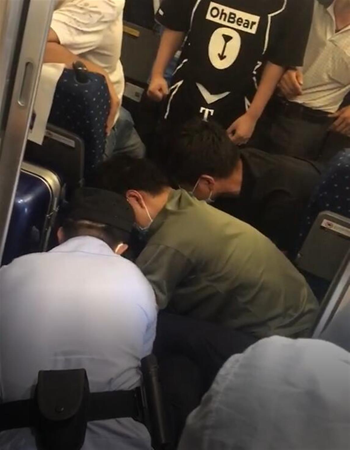 一段现场视频显示,在一节高铁车厢里,多名男子联手控制住一名男子,两名列车乘务员则说:“你冷静一点。”另一段视频显示,被控制的男子头发为黄色,被多名男子牢牢控制住,一名民警也已到现场处置。