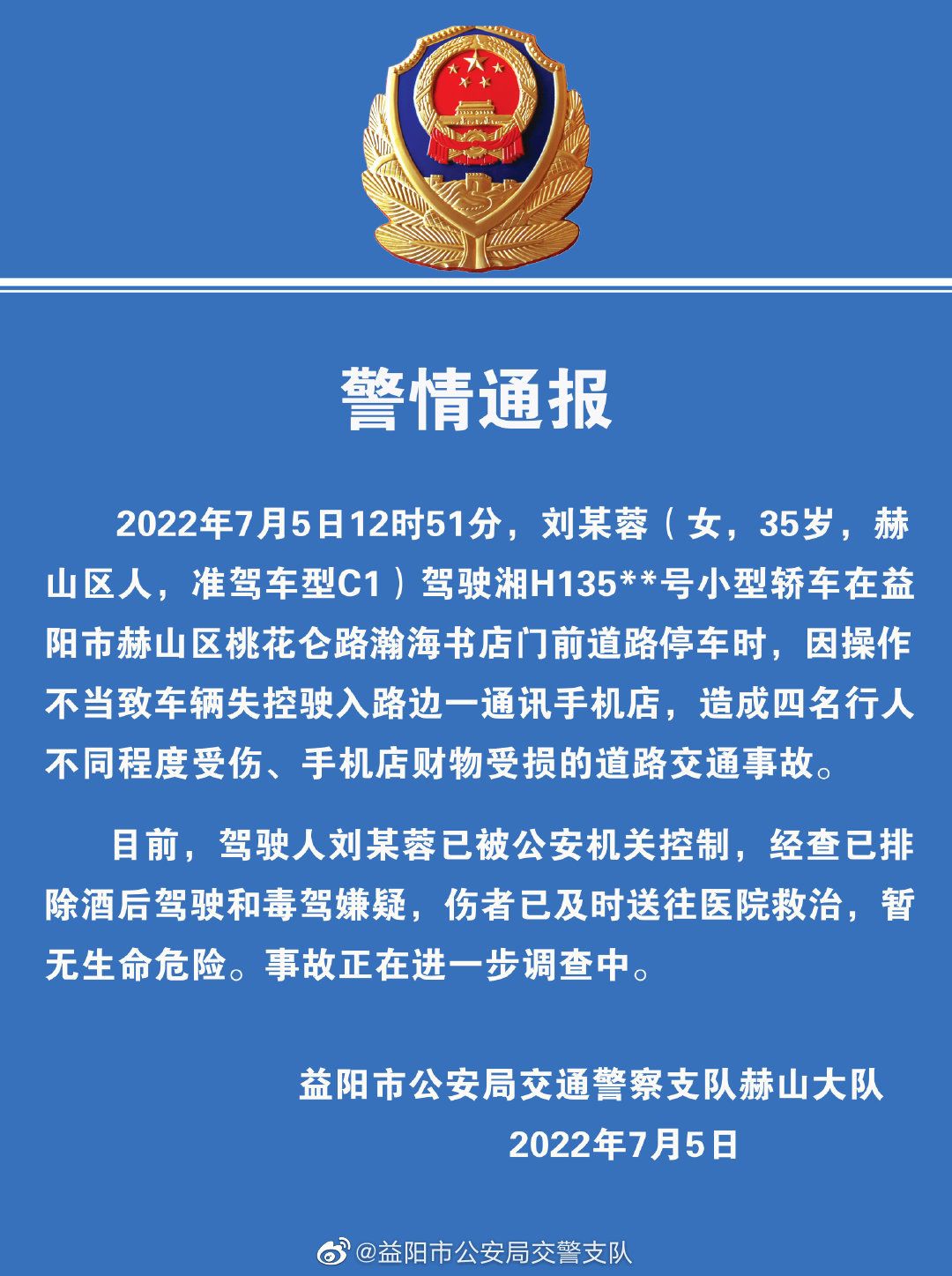 @益阳市公安局交警支队 微博消息,7月5日12时51分,刘某蓉(女,35岁,赫山区人,准驾车型C1)驾驶湘H135**号小型轿车在益阳市赫山区桃花仑路瀚海书店门前道路停车时,因操作不当致车辆失控驶入路边一通讯手机店,造成四名行人不同程度受伤、手机店财物受损的道路交通事故。