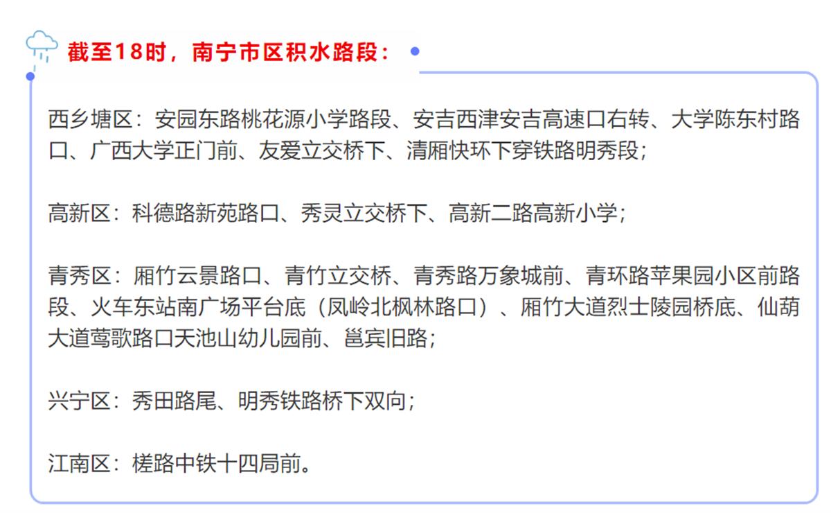 记者从南宁市交警部门获悉,截至5日18时,南宁有安园东路桃花源小学路段、安吉西津安吉高速口右转、大学陈东村路口、广西大学正门前、友爱立交桥下、清厢快环下穿铁路明秀段科德路新苑路口等路段积水。由于降雨时段正值晚高峰,南宁交警提醒市民请注意交通安全,减速慢行。