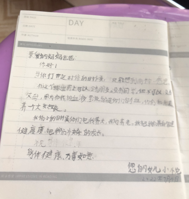 今天,“少年领读者·一封家书”编辑组收到了来自武汉市东西湖区金银潭小学的杨歆悦同学写的一封家书,表达了她对父母的感恩之情。