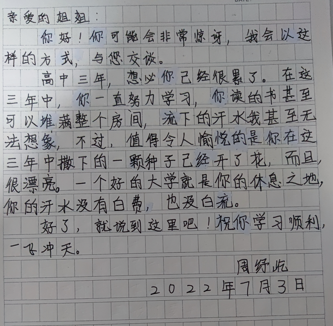 今天,“少年领读者·一封家书”编辑组收到了来自武汉市东西湖区金银潭小学的周纾屹同学写给表姐的一封家书。