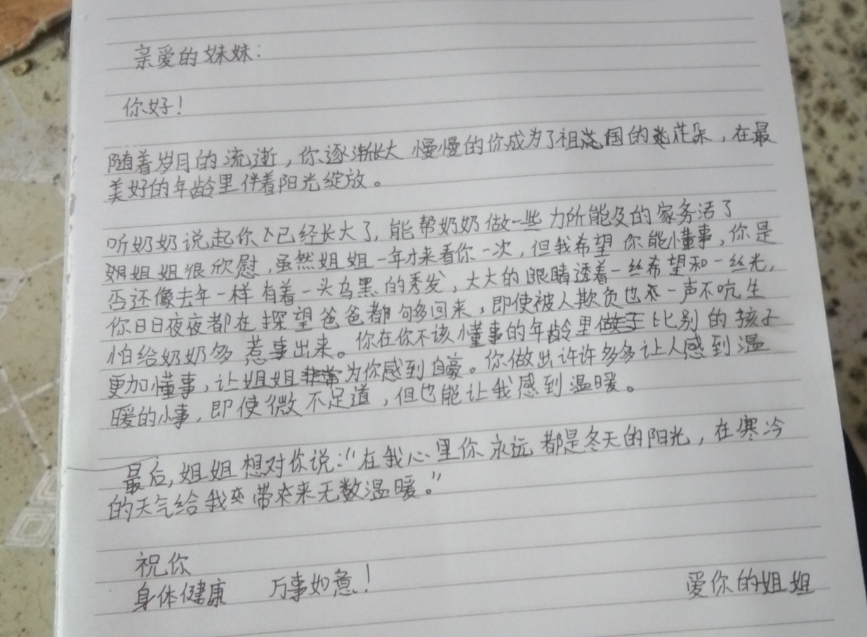 今天,“少年领读者·一封家书”编辑组收到了来自武汉市江夏区藏龙小学四二班胡玉洁同学写给妹妹的一封信。