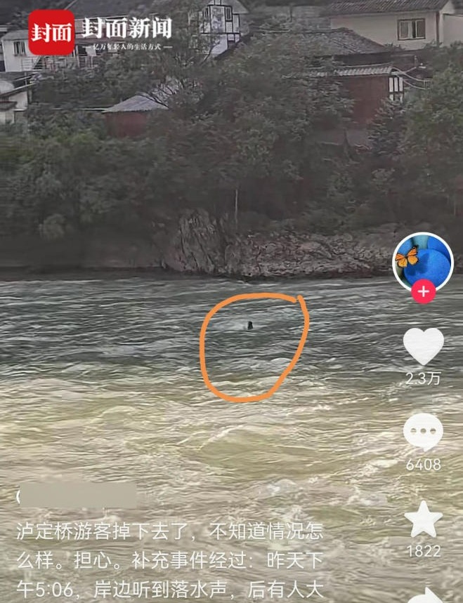 网传视频显示,正值汛期的大渡河水流湍急,一人在水中挣扎,并随着河水漂走。视频最后,落水者已完全被河水淹没。