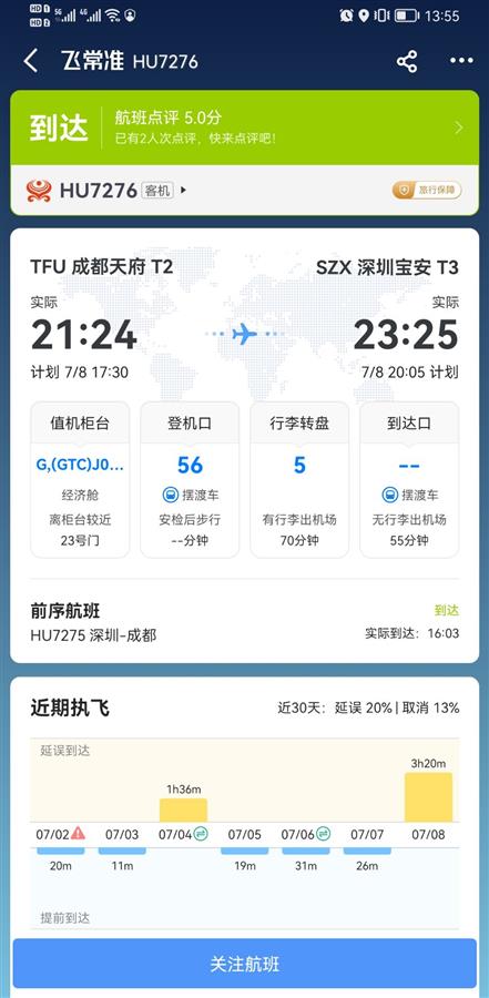 记者在飞常准上查询得知,HU7276原计划于下午5时30从成都起飞,于晚上8时05分抵达深圳。而7月8日,该航班实际起飞事件为晚上9时24分,于晚11时25分抵达。7月8日,成都市最高温为37摄氏度,成都市气象部门发布了高温橙色预警。