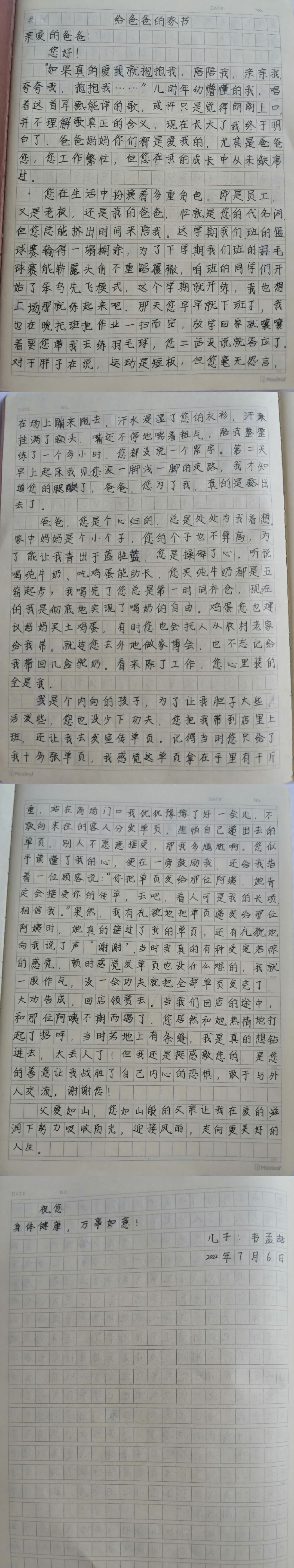今天,“少年领读者·一封家书”编辑组收到了来自武汉市青山区吉林街小学韦孟喆同学的一封信。