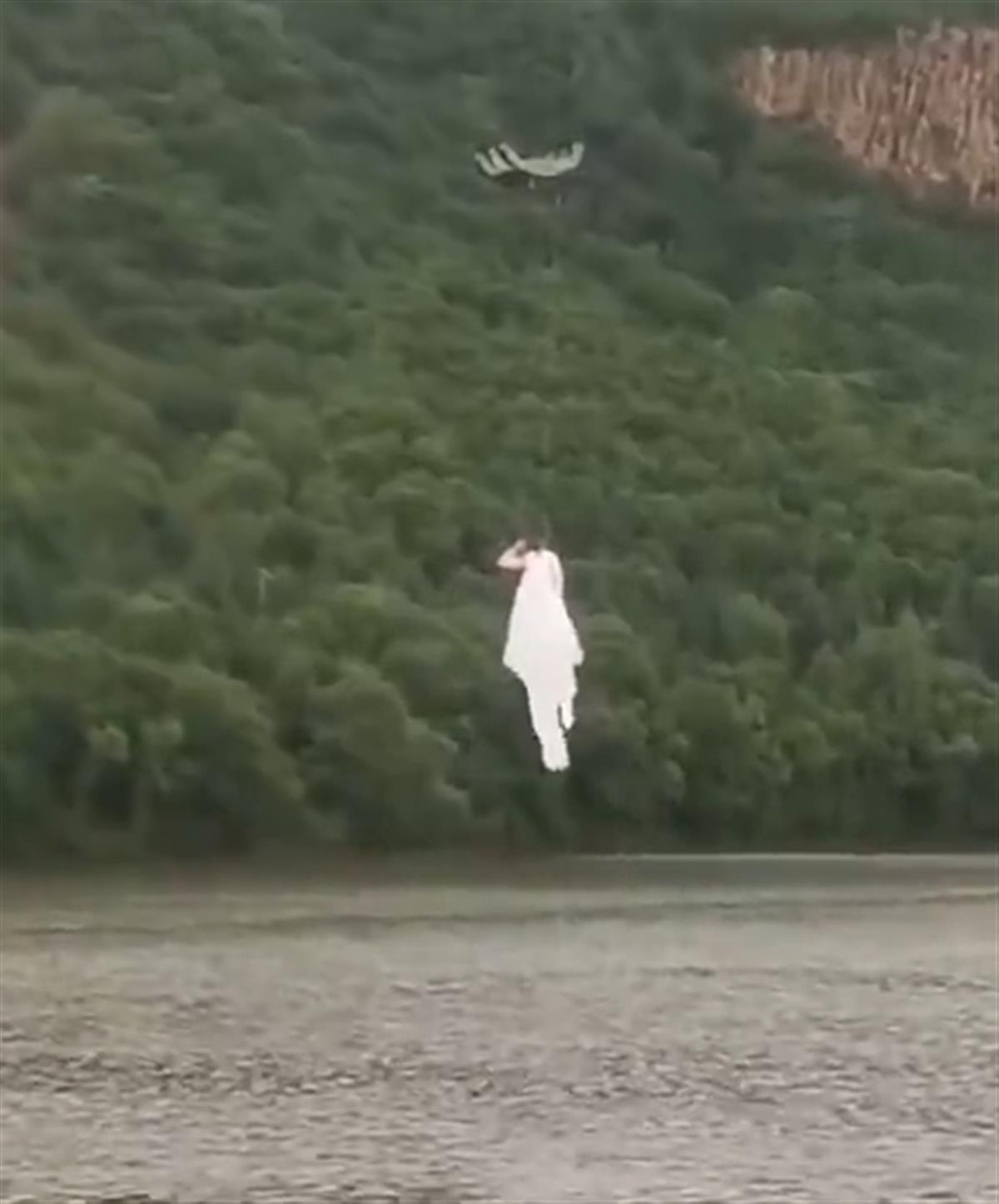 网传视频显示,水面上空几米处,一名身穿古装的人员被吊在半空,拍摄者称:“威亚出事故了,这个女孩已经在上面吊了一个小时了,一动不敢动。”从视频中可以看到,被困人员距水面有数米的距离。