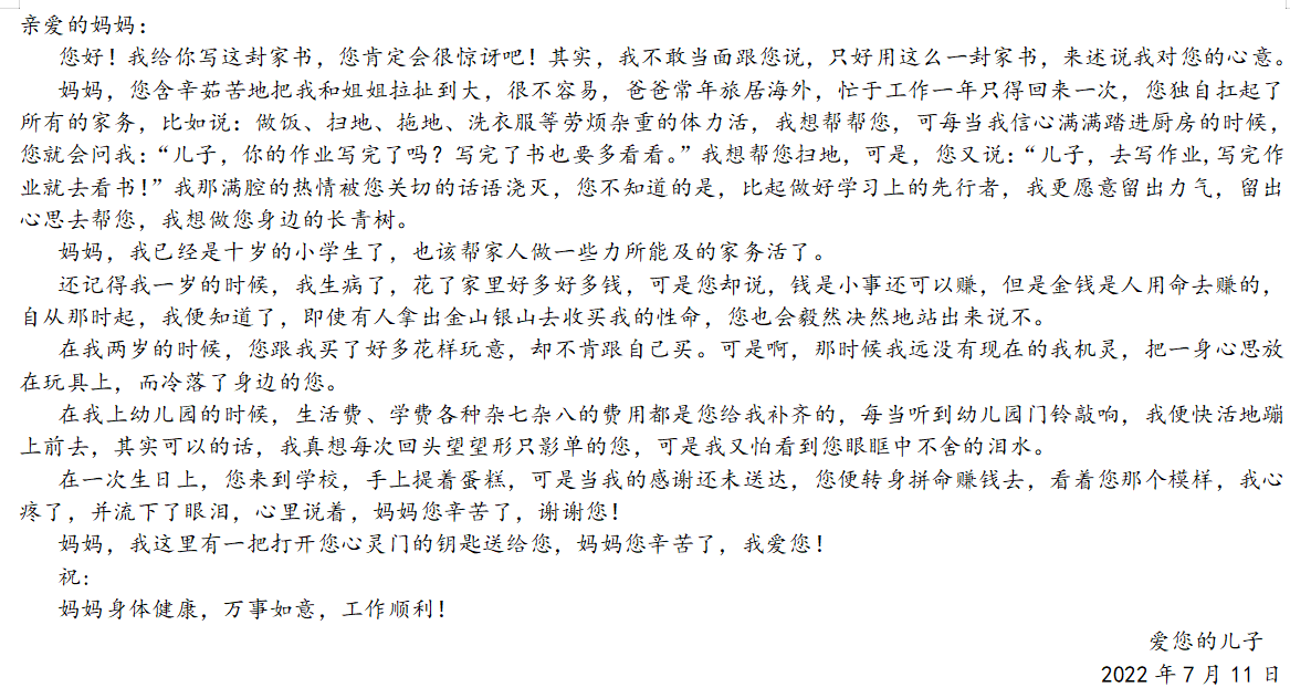 今天,“少年领读者·一封家书”编辑组收到了来自武汉市江夏区五里界小学宋兆谦同学的一封信。