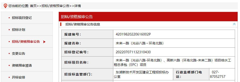 此外,武汉市公共资源交易中心官网发布《未来一路(光谷八路—环岛北路)、高新六路(环岛北路—未来二路)项目给水工程总承包(EPC)项目》招标/资格预审公告。