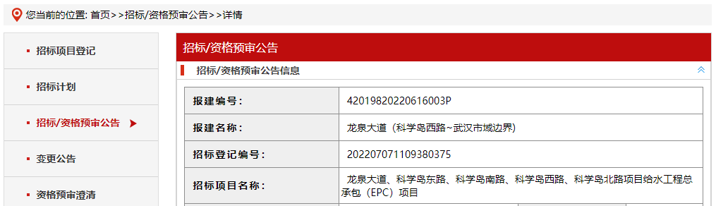 今天,武汉市公共资源交易中心官网还发布了《龙泉大道、科学岛东路、科学岛南路、科学岛西路、科学岛北路项目给水工程总承包(EPC)项目》招标/资格预审公告,计划工期为 180(日历天)。