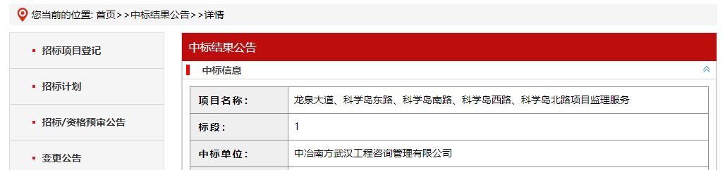近日,武汉市公共资源交易中心官网发布《龙泉大道、科学岛东路、科学岛南路、科学岛西路、科学岛北路项目监理服务》中标结果公告。中标单位是中冶南方武汉工程咨询管理有限公司,中标工期为1080(日历天)。