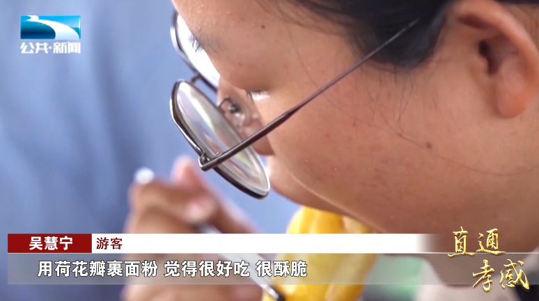 游客 吴慧宁:“用荷花瓣裹面粉,觉得很好吃、很酥脆。一口咬下去,它里面的荷花瓣还是完整的,就能清晰地看到荷花的轮廓。就是一种很新奇的感觉。”