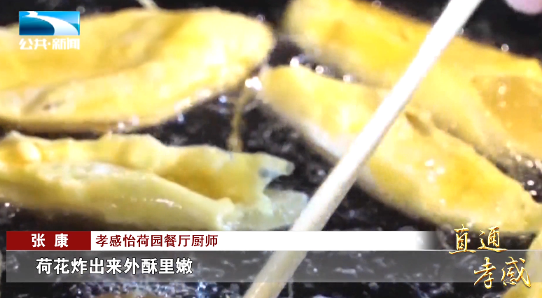 孝感怡荷园餐厅厨师 张康:“(荷花)下锅的时候是四成油温,下了以后关火炸,让它自动飘起来,炸到金黄就可以了。荷花炸出来外酥里嫩,它吃起来就像出水芙蓉,荷叶吃着微微发涩。”